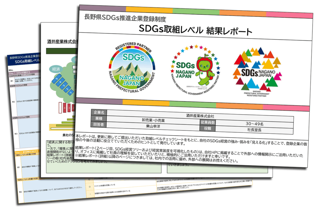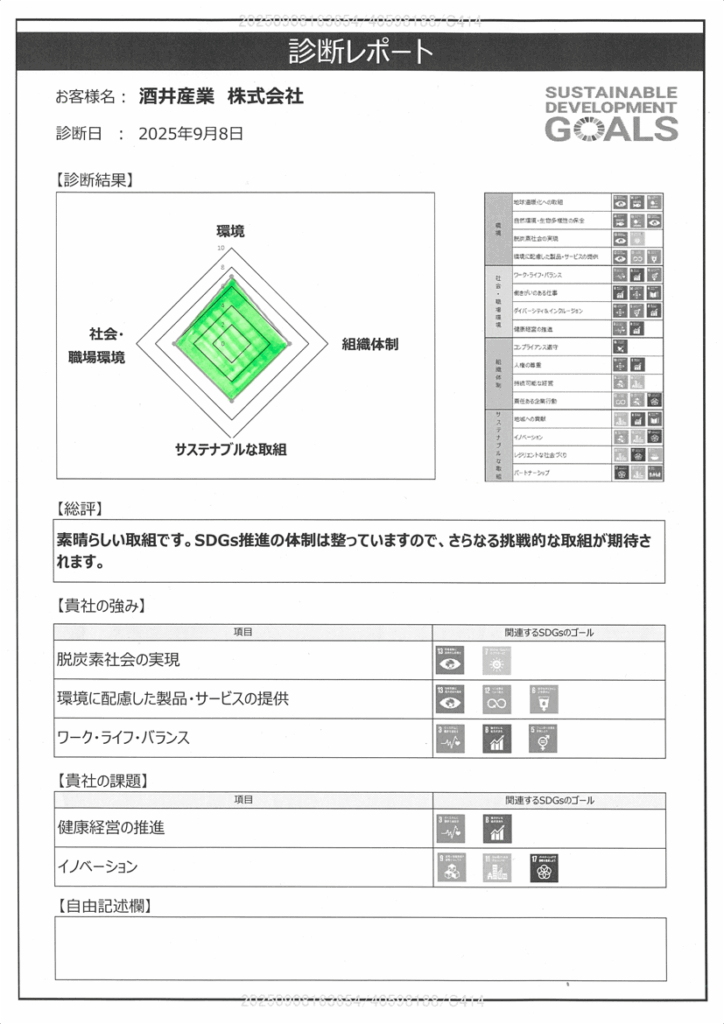 更新の際に実施した「SDGs取組レベル」の結果レポートや、金融機関様による診断レポートなどもいただいたので、これらも参考にしながら取組を継続してまいります。