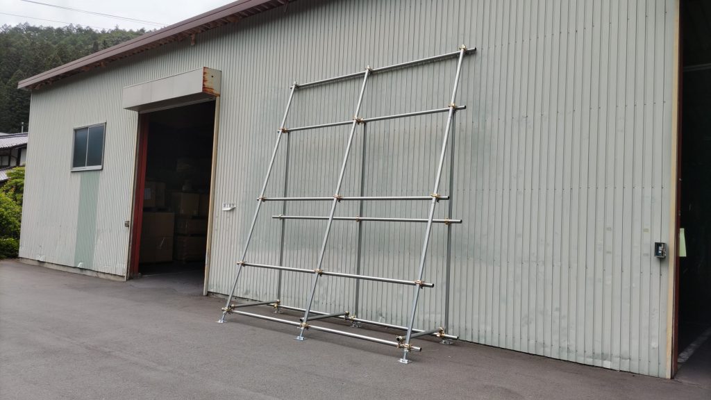 想定より大きくて丈夫な生地だったので、安全性を考慮してどのように掲示するか検討し直し、最終的に単管パイプで作った枠に掲示することにしました。