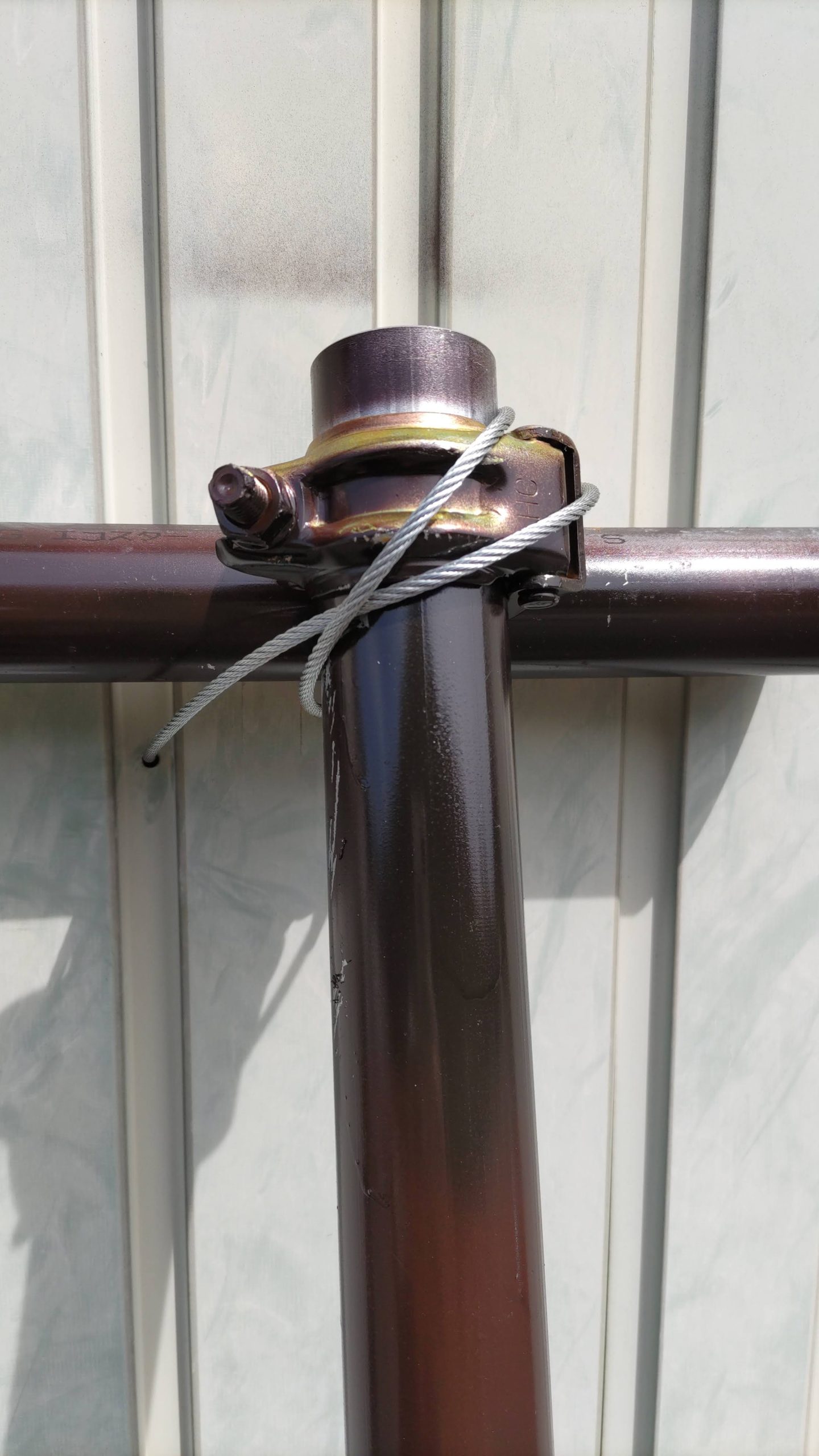 単管の総重量自体がかなりあることに加えて、上部を金属製のワイヤーロープで倉庫の鉄骨に結わえ、下部には土のうを置きました。